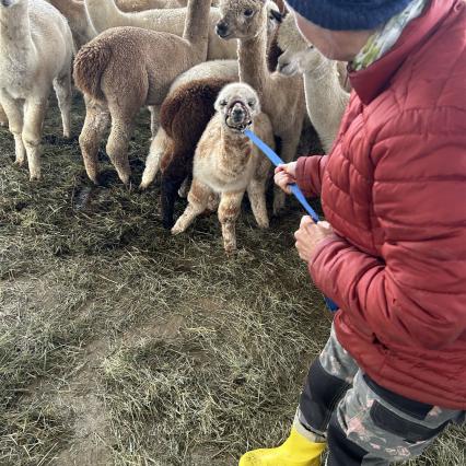 Heute ist Samstag, 08.11.2025, - die jungen Alpakas bekommen heute das erste Mal ein Laufgeschirr angelegt! Das ist vollkommen ungewohnt und natürlich wehren sich die stolzen Jungs dagegen. Das Anlegen muss sehr behutsam und in kleinen Schritten erfolgen - nur wenn sie das Laufgeschirr gerne tragen, können sie später für Alpaka-Wanderungen genommen werden. Heute beginnt also das Erwachsen werden für die kleinen Jungs!